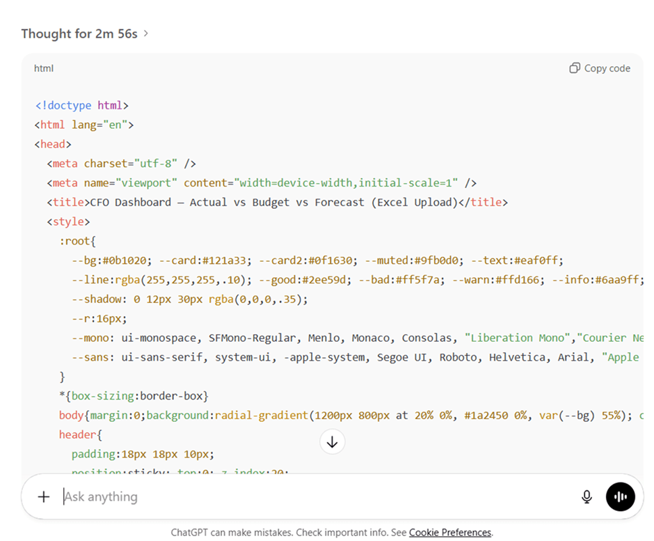 "אני CFO. בנה לי דאשבורד אינטראקטיבי בקובץ HTML יחיד. הקובץ צריך לאפשר לי להעלות קובץ אקסל (בצד הלקוח), לנתח שונות (Variance) בין תקציב לביצוע, ולהציג תרשים Waterfall ומגמות חודשיות. השתמש בספריית Chart.js או Plotly. ודא שהנתונים מעובדים מקומית בדפדפן מטעמי אבטחה."
